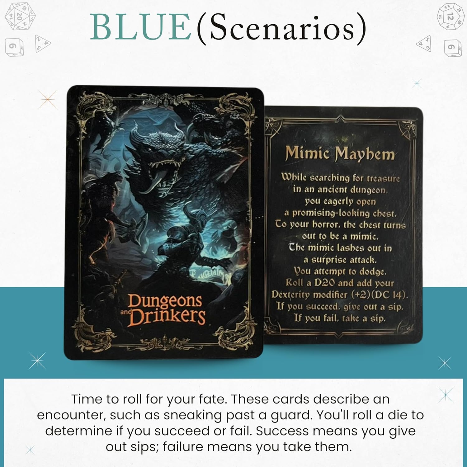 - THREE EPIC WAYS TO PLAY: Your fate lies within a deck of cards split into three unique categories. Relive your campaigns with: Green "Experiences" cards , face perilous challenges with Blue "Scenario" cards that test your luck with a dice roll , and prove your arcane knowledge with Red "Lore" cards that challenge your party's D&D trivia skills.